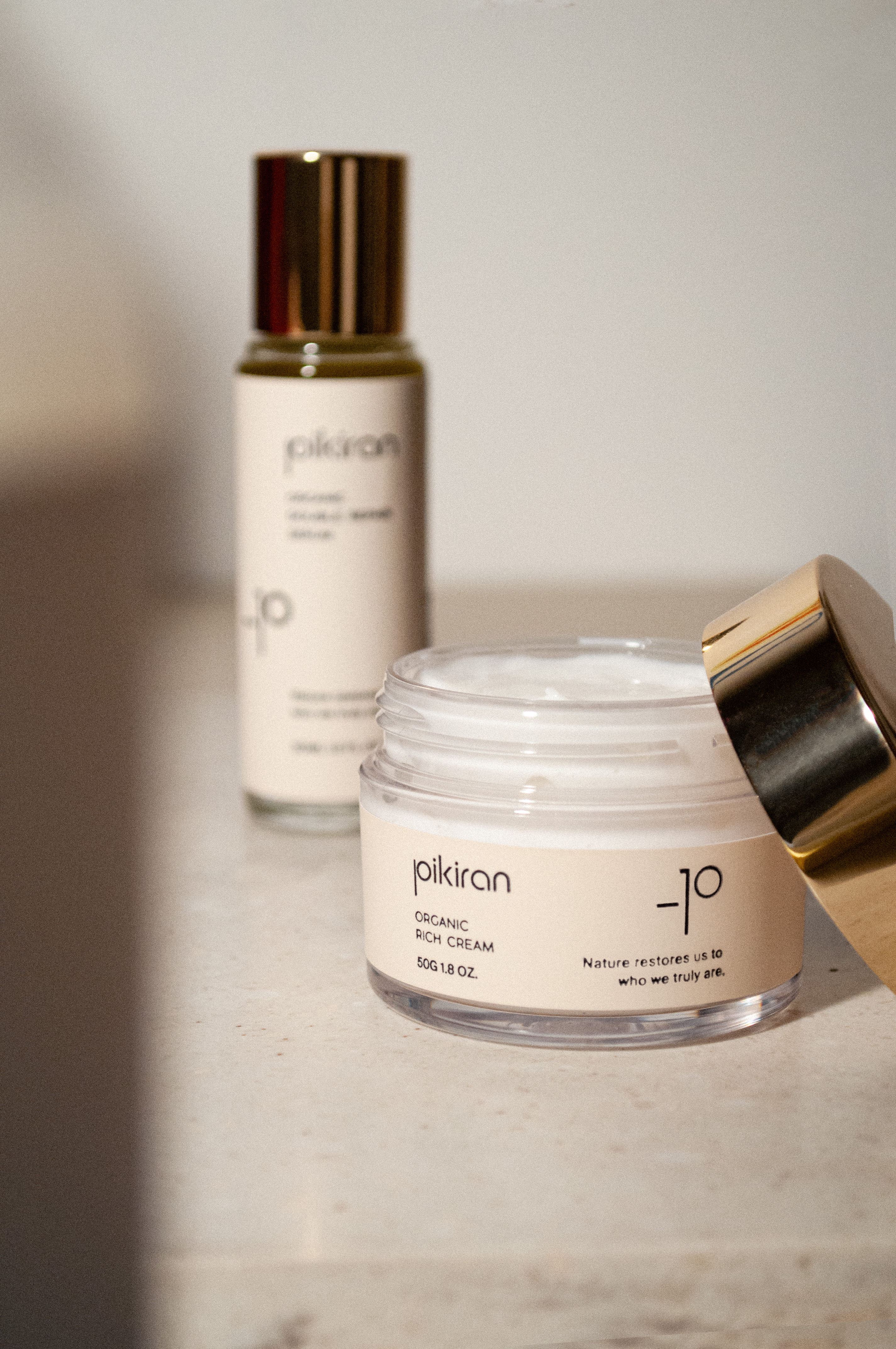 「-10歳顔をつくるセルフケア」というpikiranのブランド・サービスコンセプトを、頭文字の「p」で象徴的に表現したロゴ案。ロゴタイプもその印象を踏襲し、しなやかさと健やかな美しさをニュートラルな書体で表現しています。